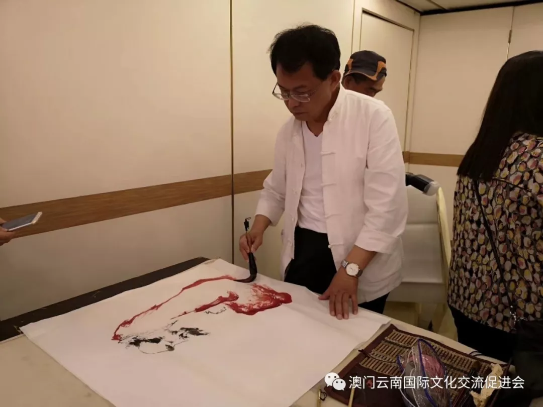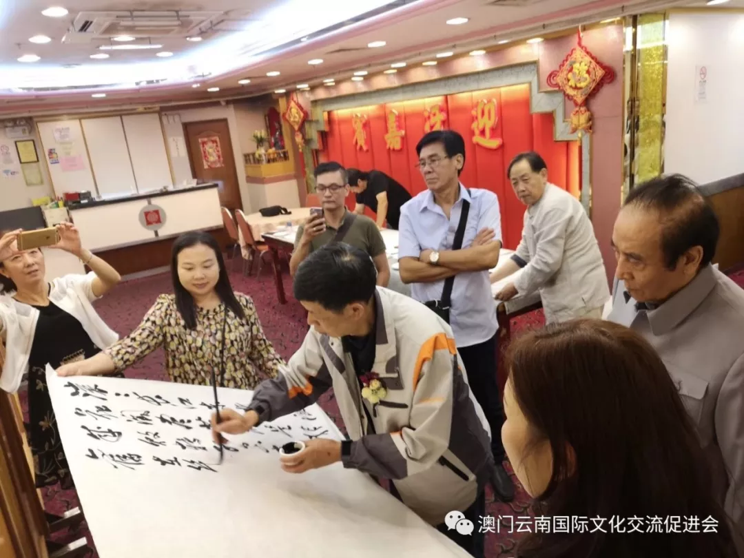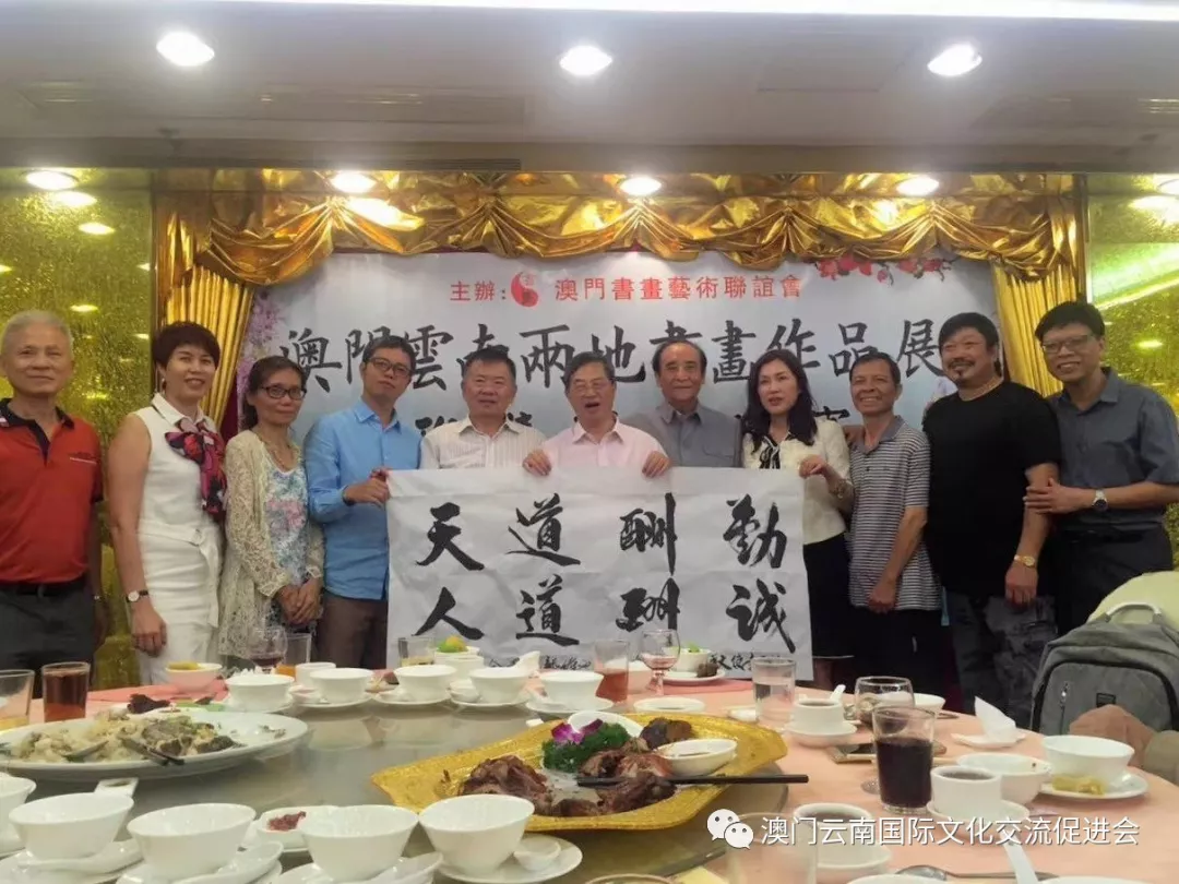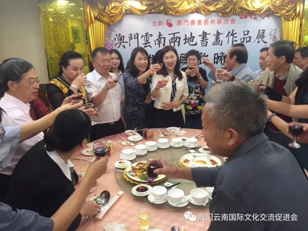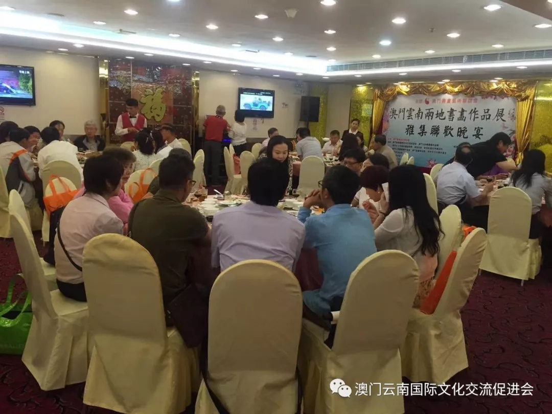 开幕庆典结束后,主办方于好世界酒楼席开四桌,宴请澳滇两地书画艺术家,并举行联谊笔会。